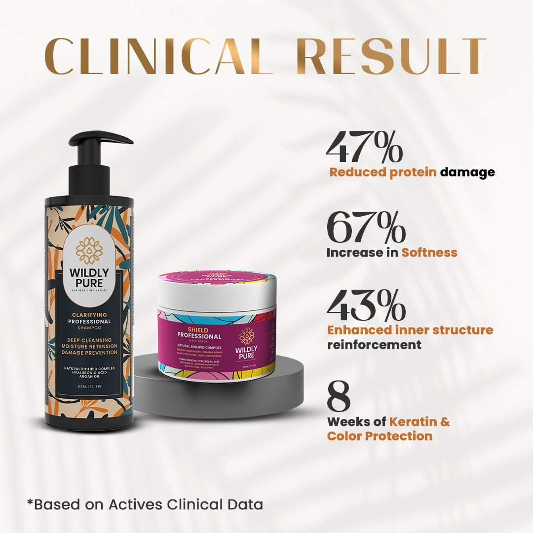 Hit reset on dull, damaged hair with the perfect detox-and-repair duo. The Natural Reset Clarifying Shampoo deeply cleanses buildup, excess oil, and hard water damage without stripping moisture, making it ideal for oily scalps and all hair types. Paired with the Shield Hair Mask, this at-home keratin treatment delivers salon-like results in just 15 minutes. Powered by Plant Keratin, a Natural Biolipid Complex, and Hyaluronic Acid, it strengthens strands, restores moisture, and provides 8 weeks of color protection. Together, this combo purifies, hydrates, and fortifies your hair—leaving it soft, smooth, and full of life.