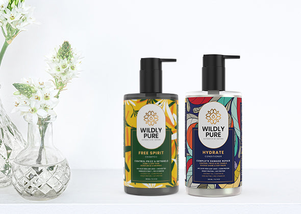 Experience the ultimate frizz control with Wildly Pure Frizz Control Ultimate Combo. Free Spirit Shampoo caters to diverse hair needs, defining and enhancing curls, while Hydrate Conditioner deeply moisturizes dry, frizzy hair. Infused with omega 3, 6, and 9, Free Spirit Shampoo tames frizz and retains moisture, while Hydrate Conditioner nourishes and strengthens with a luxurious blend of Biolipid complex, plant keratin, and Shea Butter. Elevate your haircare routine and achieve smooth, hydrated locks with this dynamic duo. Say goodbye to frizz and hello to beautifully defined curls with Wildly Pure Frizz Control Ultimate Combo.