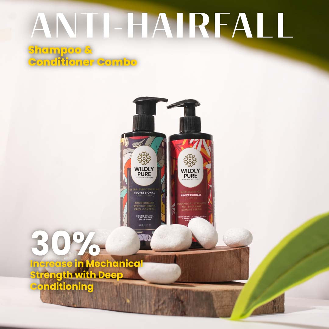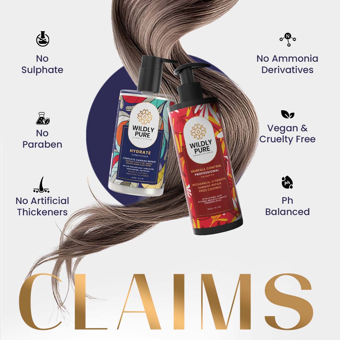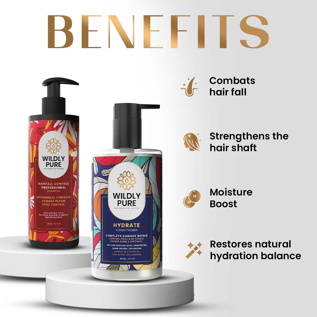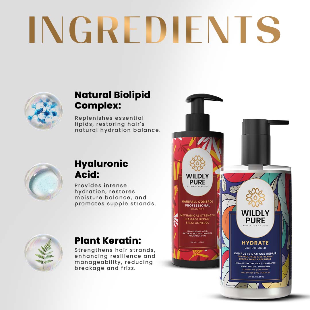 Experience the ultimate hair care regimen with Wildly Pure's Hair Fall Control Shampoo and Hydrate Conditioner combo. The Hair Fall Control Shampoo, enriched with biofunctional carbocysteine and polypeptide coatings, combats hair fall, dryness, and frizz. Tailored for dry and frizzy hair, it strengthens the hair shaft, reduces breakage, and enhances resilience. The Hydrate Conditioner, with its luxurious blend of Biolipid complex, plant keratin, and Shea Butter, deeply hydrates and smoothens hair, promoting resilience and manageability. Replenishing essential lipids and restoring natural hydration balance, this combo delivers silky-smooth, nourished strands with each use, elevating your haircare routine to luxurious heights.